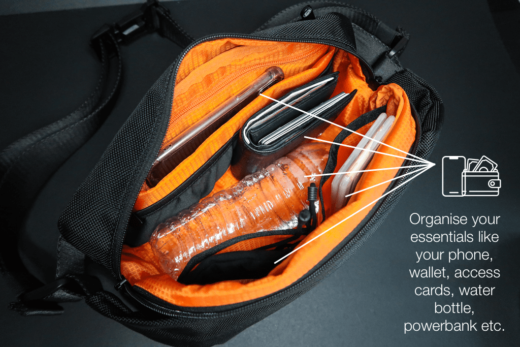 ✅ The Sling V2 will fit a 600 ml Water Bottle, Powerbank, Charging Cables, A Phone & Your Wallet - all while keeping a relatively small and compact size!